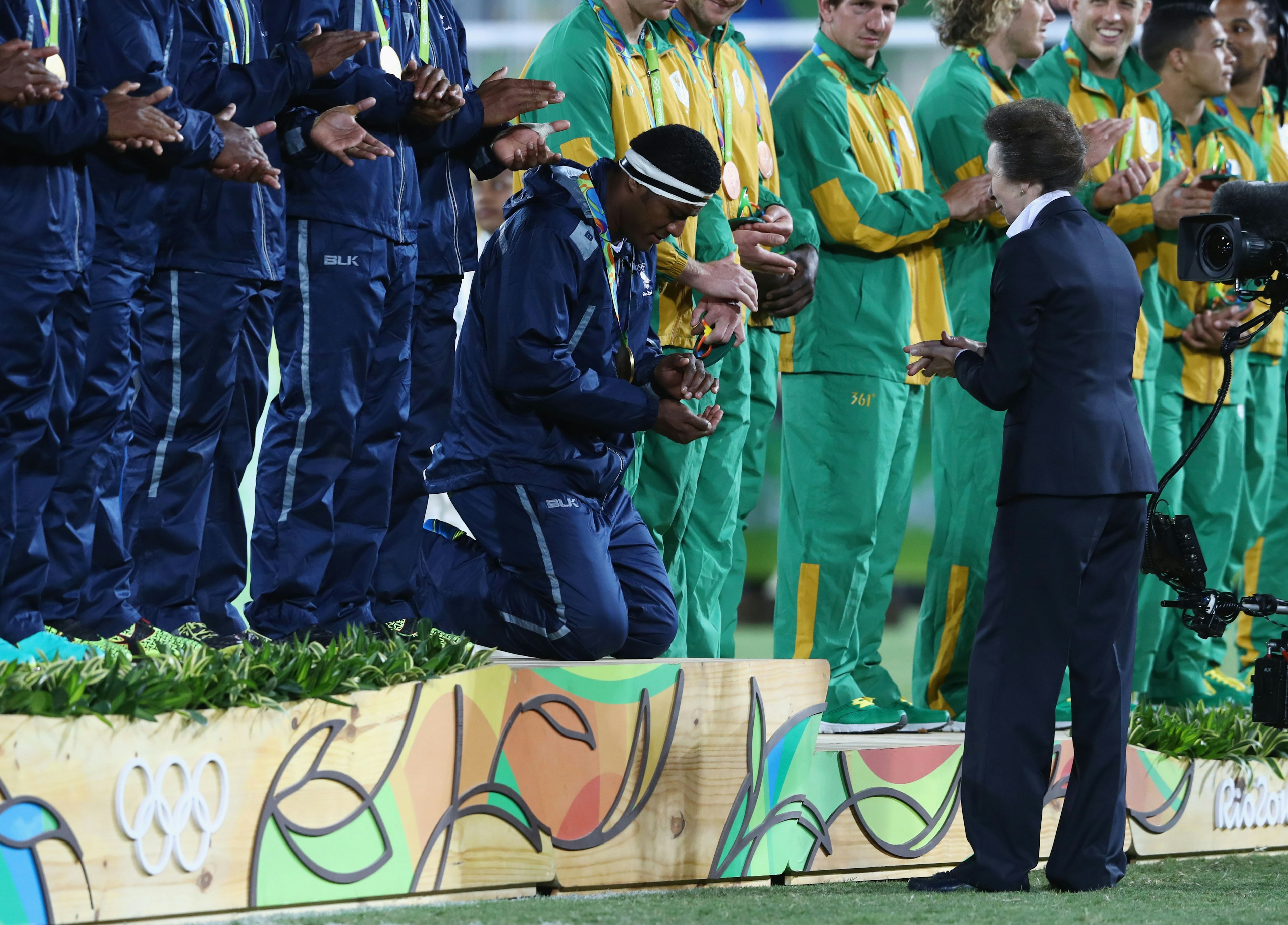 Yıllardır beklenen o an gelmiş ve Fiji, olimpiyat sahnesinde bir altın madalyayla kendine yer edinmişti. Yedili ragbi madalya töreni ise başlı başına bir hikâyeye dönüştü. Madalyaları Birleşik Krallık kraliyet ailesinden Prenses Anne takdim ediyordu. Sıra altın madalyaya geldiğinde, Fijili oyuncular madalyalarını almak için hafifçe eğilmek yerine dizlerinin üzerine çöktüler. Fiji, kültürüyle de podyumdaydı; zira önemli bir ödülün takdimi sırasında dizlerinin üzerine çöküp karşındakini kısaca alkışlamak, Fijililer için çok eskiye dayanan bir gelenekti. Ragbicilere uyum sağlayan Prenses Anne de oyuncuların alkışlarına karşılık vermeye başladı. Her maç öncesi attıkları savaş naralarıyla meydan okumayı kabul eden ve rakiplerine korku salan Fijililer, bu kez olabildiğince samimi ve içten görünüyorlardı.